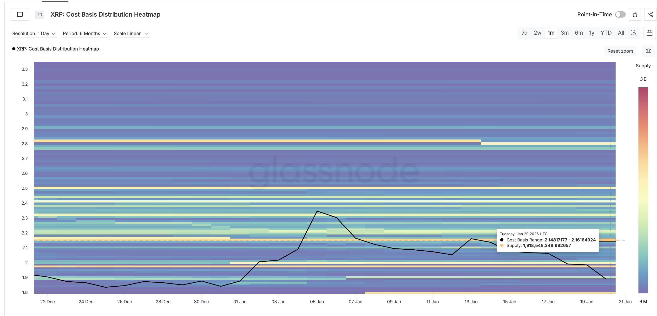 Above that, the strongest near-term resistance sits between $2.14 and $2.16. This range contains approximately 1.92 billion XRP, making it the heaviest supply cluster above the current price.