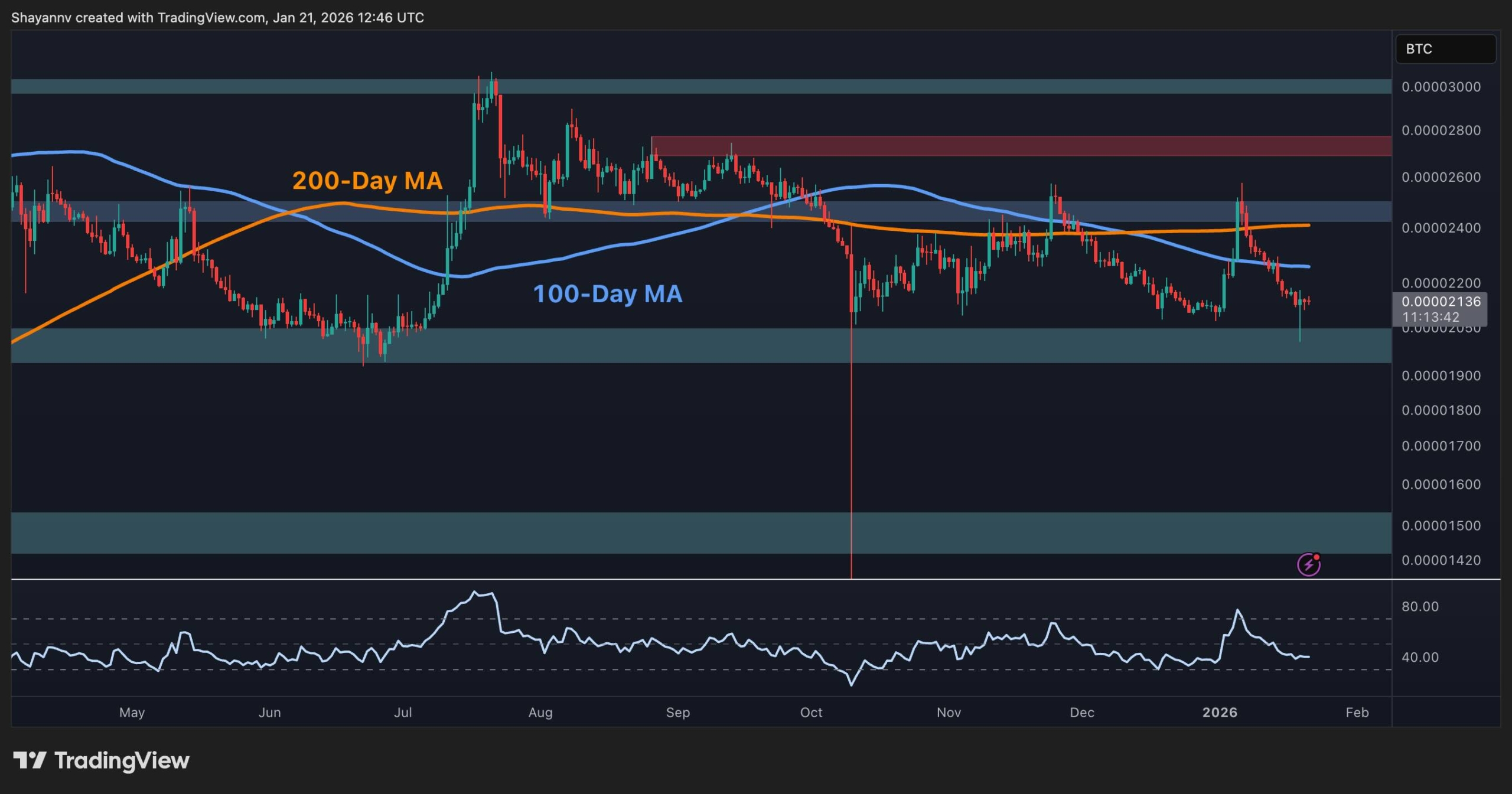 The subsequent sell-off has driven the price back below the 100-day moving average (located around the 2,200 sats mark) and toward the lower half of the multi-month range around 2,000 sats, with a notable downside wick signalling initial dip-buying interest but not yet a confirmed reversal.