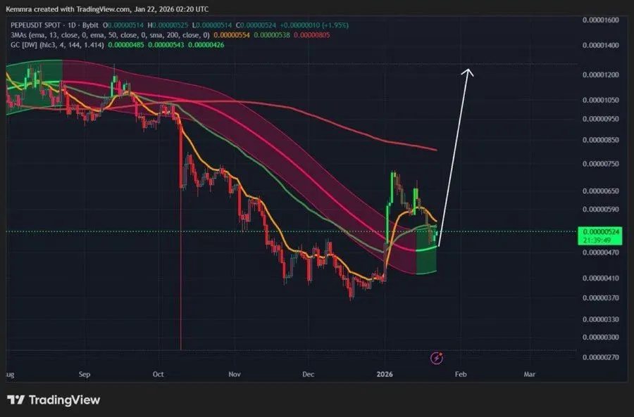 Recent data shows that PEPE has hit the projected target with precision, confirming the validity of the prior setup and signaling the end of the corrective phase. From the chart, price bounced strongly from the $0.0000040–$0.0000042 demand zone and is now trading around $0.0000053. This move reclaimed key short-term moving averages and pushed price back into the mid-band of the Gaussian channel, a technical shift that typically marks the transition from bearish control to trend expansion. The formation of a higher low after months of downside pressure strengthens the bullish case.