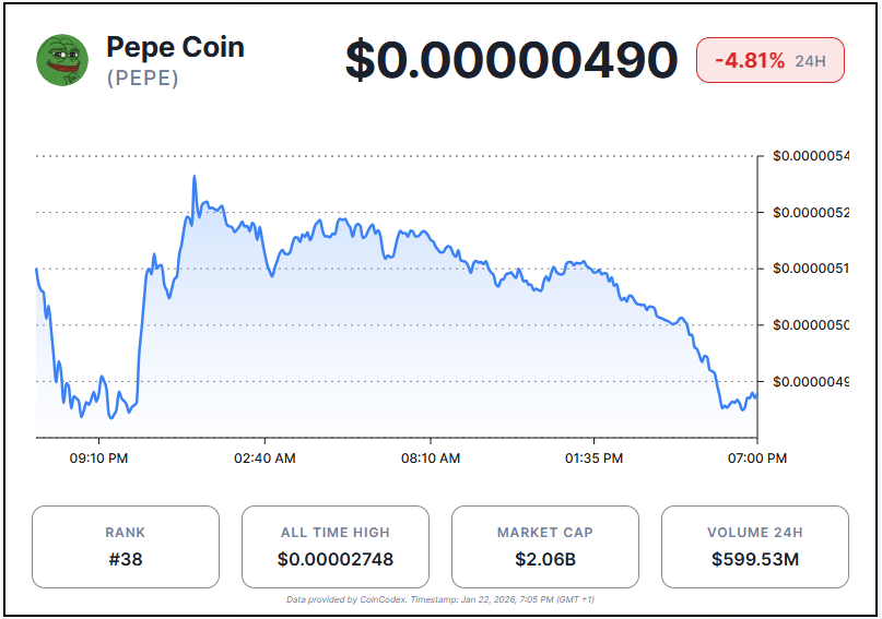 PEPE's price has declined by 4.81% over the past 24 hours, currently trading around $0.00000490. The daily price range has fluctuated between $0.000004847 and $0.000005314, indicating some intraday volatility.