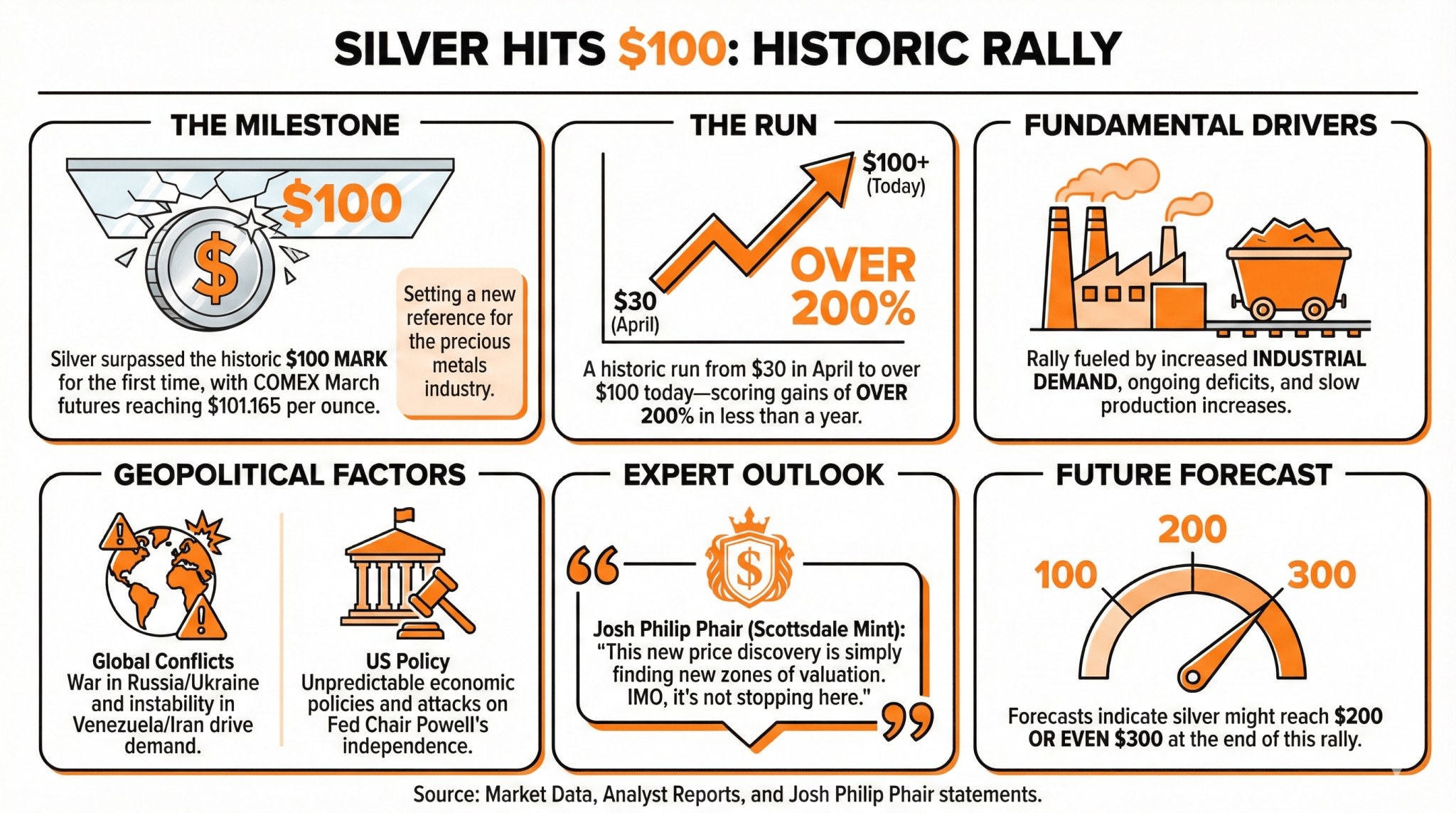 What recent milestone has silver achieved in the investment market? Silver surpassed $100 per ounce for the first time, with COMEX March futures hitting $101.165, setting a new benchmark for the precious metals industry.