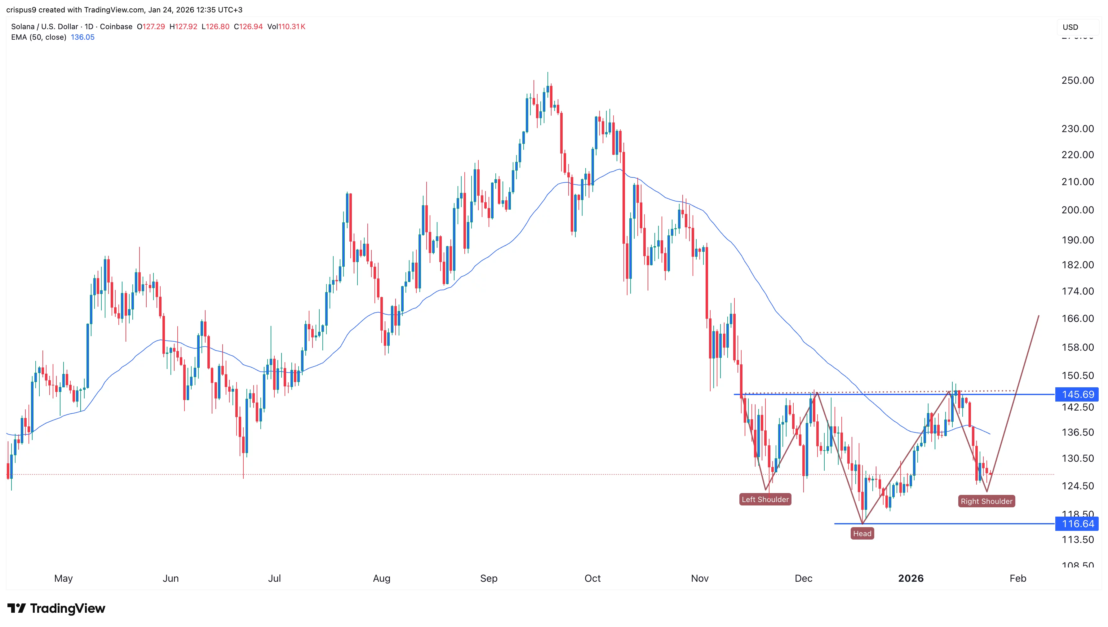 A closer look shows that Solana has formed a bullish chart pattern, pointing to an eventual rebound. It formed an inverted head-and-shoulders pattern and is now at the right shoulder.