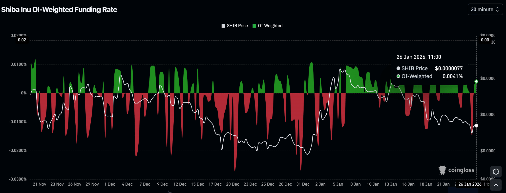 Elsewhere, Shiba Inu’s OI-weighted funding rate has spent much of the period oscillating around the zero line, with frequent flips between positive and negative readings. In early January, the funding rate shifted more consistently positive alongside a short-lived price rebound, suggesting longs were paying shorts as leverage leaned more bullish.