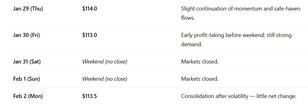 After a historic rally, silver is likely to remain elevated but consolidating, with spot closing near $114 on the next two trading days and settling around $113.5 on the first trading session of February 2026.