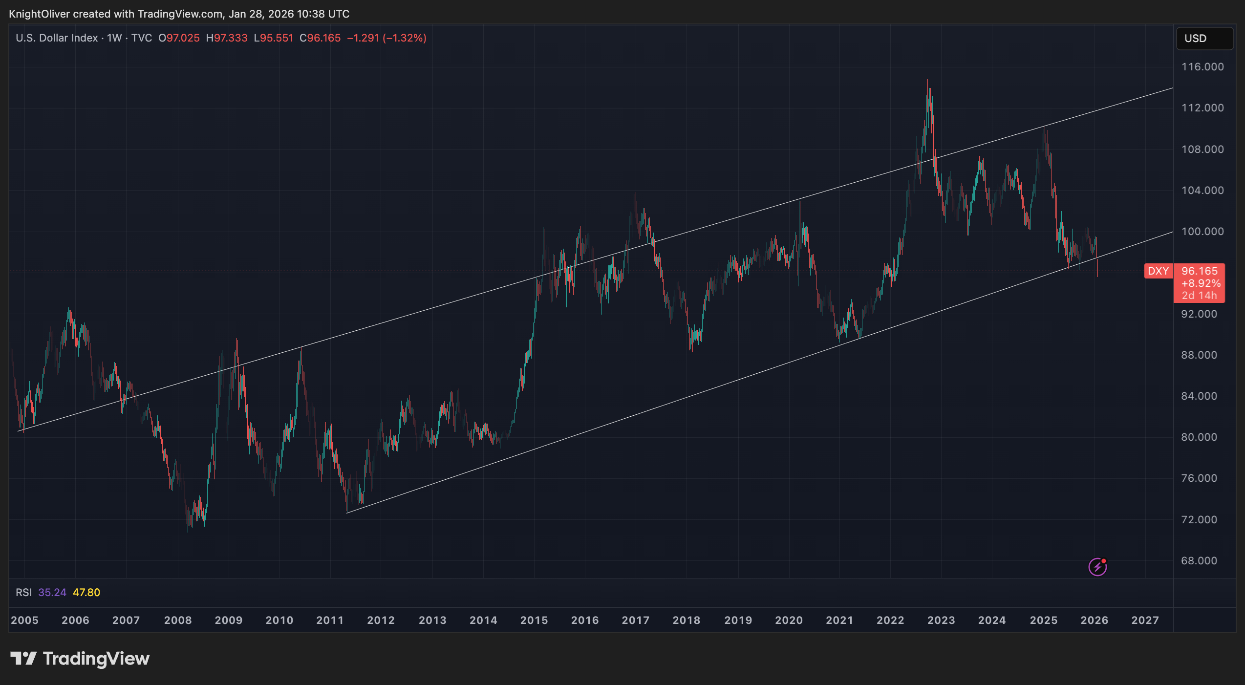 The Dollar Index (DXY) fell to a four-year low on Tuesday, crucially below a trendline dating back to 2011 despite an attempt by President Donald Trump to reassure markets by saying the dollar is "doing great," and that he is not "concerned."
