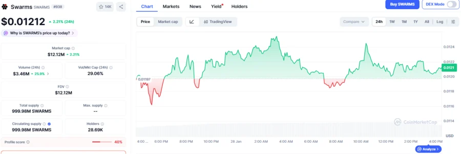 Swarms has been experiencing market difficulties over several recent weeks. Despite that, things are beginning to change. As reported by CoinGecko data, Swarms has been down 4.9% and 16.6% over the past week and month, respectively, showcasing its market slump. However, today the asset recorded an 8.8% rise over the past 24 hours, making its price currently trade at $0.01212, showing that users are starting to show enthusiasm in the Swarms platform, with buyers entering the market with rising accumulations.