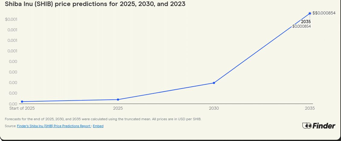 According to a 10-year forecast from Finder’s panel of experts, Shiba Inu could post a dramatic rally by 2035. The panel estimates $SHIB could reach $0.000854, implying a potential surge of roughly 11,229% from current levels.