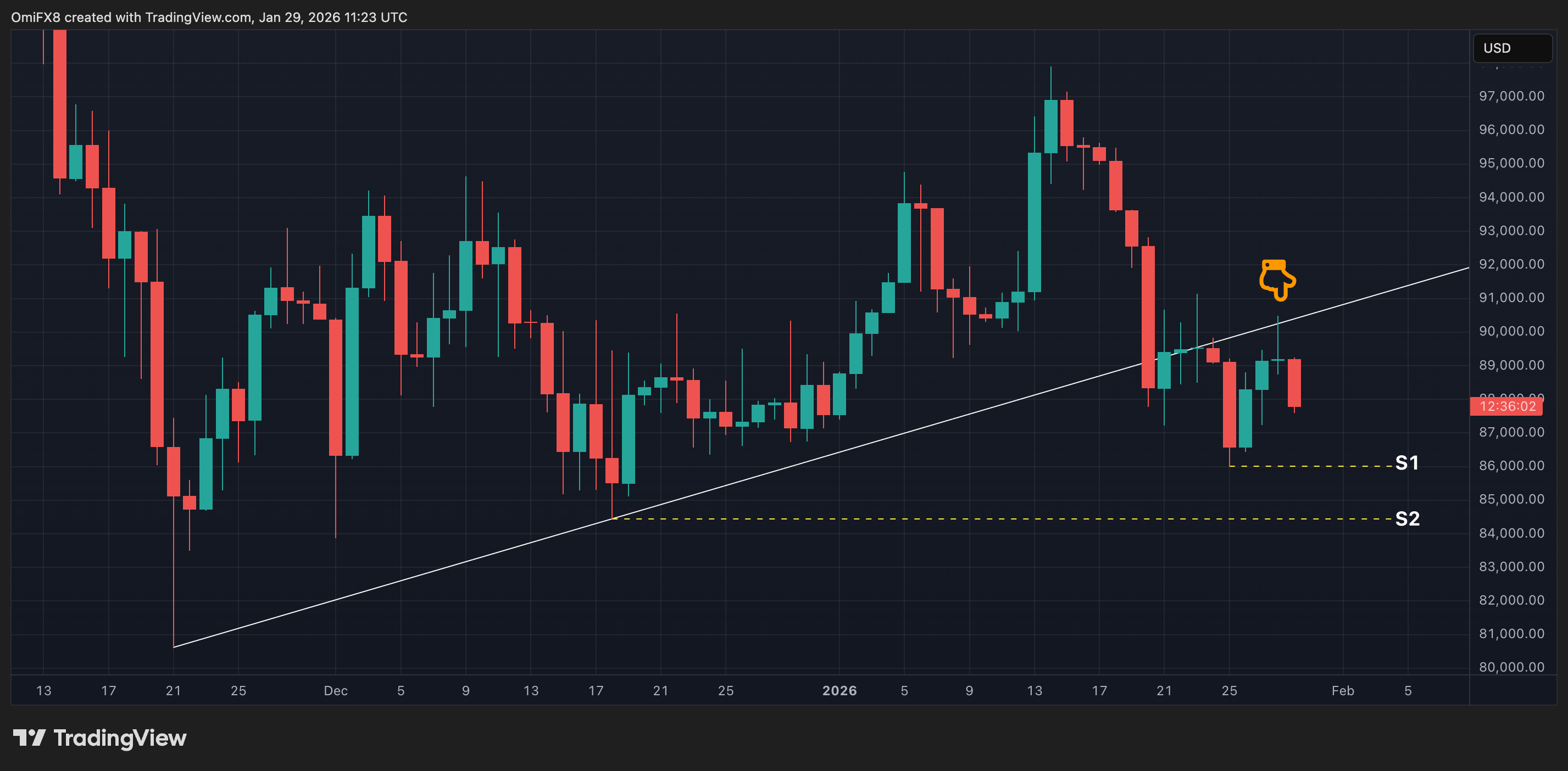 - That has shifted the focus to support first at $86,000 followed and then, if it falls through, at $84,445.