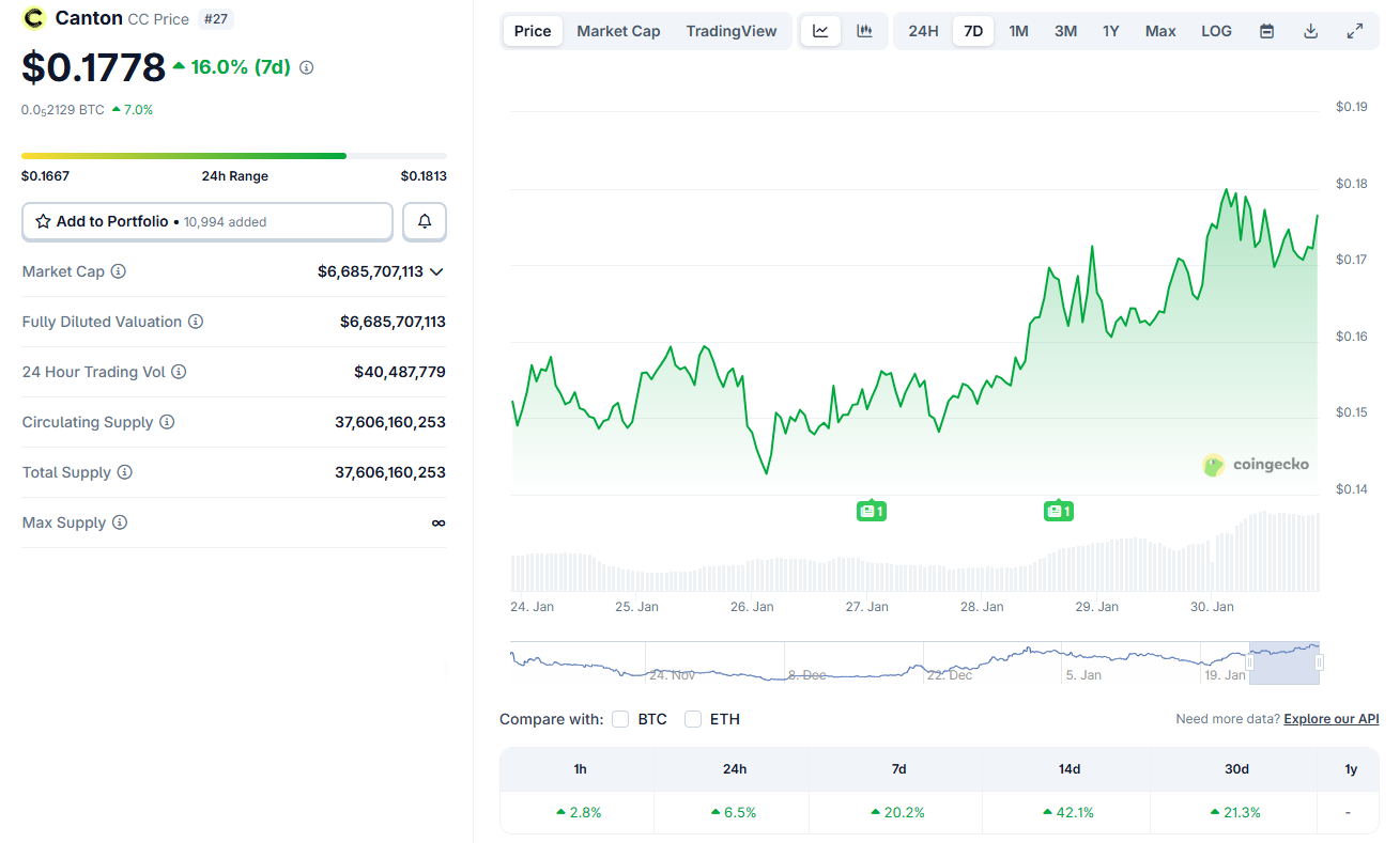 While most cryptocurrencies are under pressure, Canton (CC) has been rising steadily.