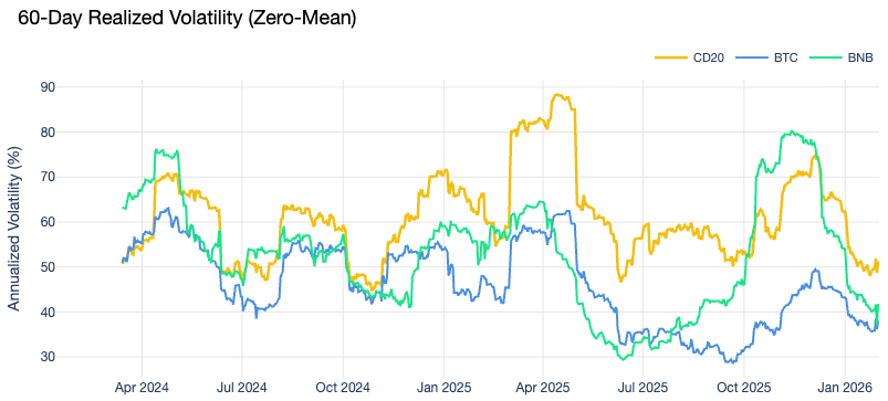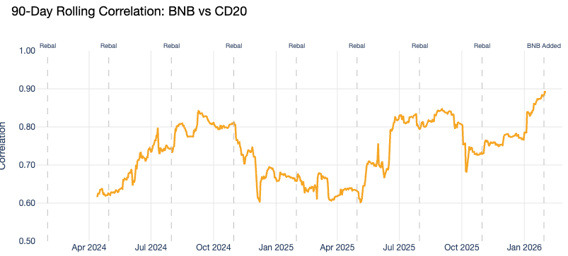 From a portfolio construction perspective, this is a meaningful shift. $BNB has historically exhibited lower volatility than the broader CD20, which could reduce the index's overall risk profile. Its correlation with other index constituents has been moderate rather than lockstep (until recently, at least), adding a diversification benefit. The potential outcome: a lower-risk, more diversified index.