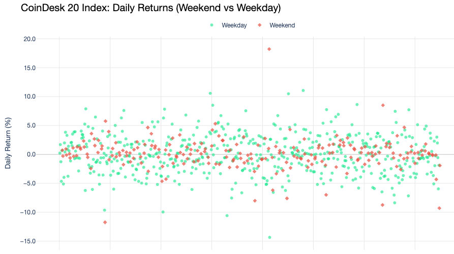 The scatter plot shows daily returns for the CoinDesk 20, with weekend moves highlighted separately. Yes, there are a few instances of outsized downside moves on Saturdays and Sundays. But there are plenty of quiet weekends too — and plenty of weekday chaos that doesn't fit the narrative.
