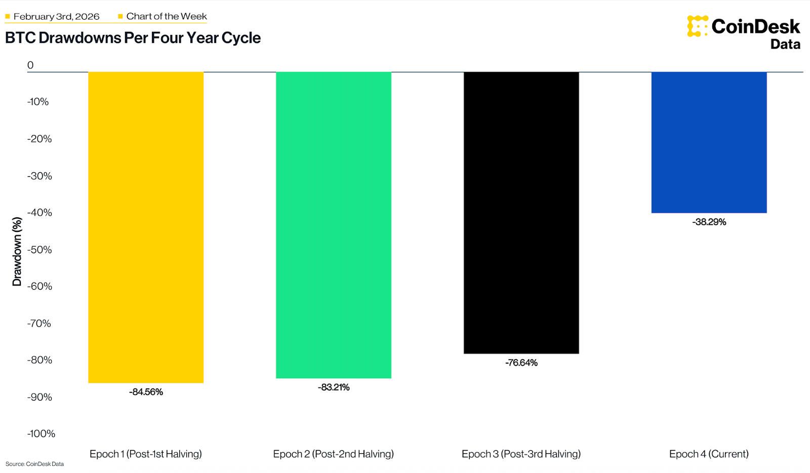 Bitcoin’s peak-to-trough drawdowns have steadily compressed over time, moving from -84% in the first epoch (post-1st halving) to a current cycle maximum of -38% as of early 2026. This persistent reduction in "peak pain" suggests a structural shift toward market maturity, as institutional capital and spot ETFs establish a more stable price floor compared to the retail-driven 80%+ crashes of previous eras. Historically, bitcoin has taken approximately 2 to 3 years (roughly 700 to 1,000 days) to fully recover from major cycle bottoms to new highs, though recovery speed has recently increased, with Epoch 3 reclaiming its peak in only 469 days.