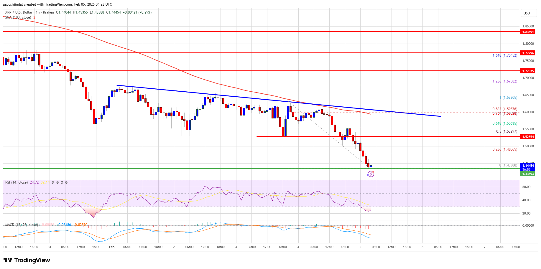 Hourly MACD – The MACD for $XRP/USD is now gaining pace in the bearish zone.