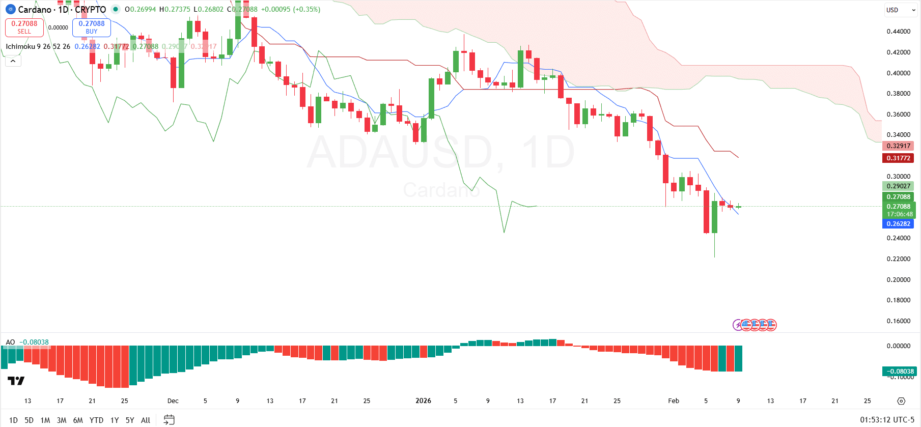 Short-term momentum also shows continued weakness. The conversion line has crossed below the baseline and is tracking prices lower. Meanwhile, the lagging span sits well below prior price action, confirming that current price levels remain weaker than historical ranges. Immediate support forms around the $0.24–$0.26 area, which has absorbed recent selling pressure. However, any loss of this zone would expose $ADA to deeper downside risk.