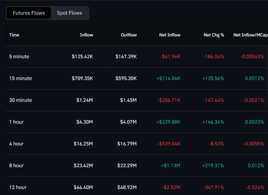 Looking further out, the 4-hour window showed a net outflow of $539.04K, reinforcing caution among swing traders, while the 8-hour timeframe showed a net inflow of $1.13M. However, that optimism faded again on the 12-hour window, which posted a net outflow of $2.52M, signaling renewed defensive positioning.