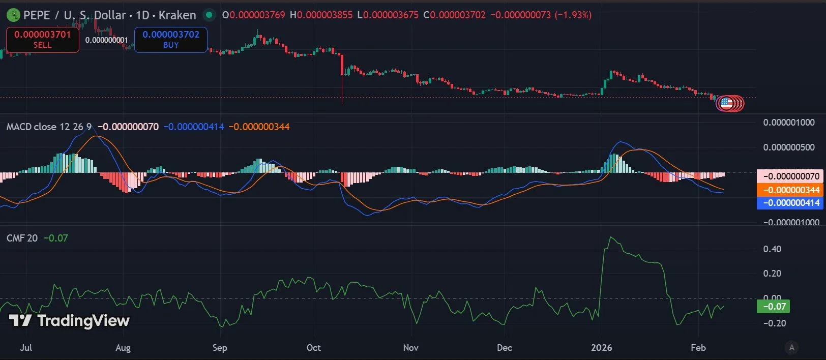 The technical indicators reinforce this trend. The MACD line is below the signal line, and the histogram shows negative bars, signaling continued bearish momentum. The Chaikin Money Flow (CMF) is at -0.07, suggesting capital is flowing out of the market, which supports the downward price movement. These indicators highlight that sellers are currently controlling the market.