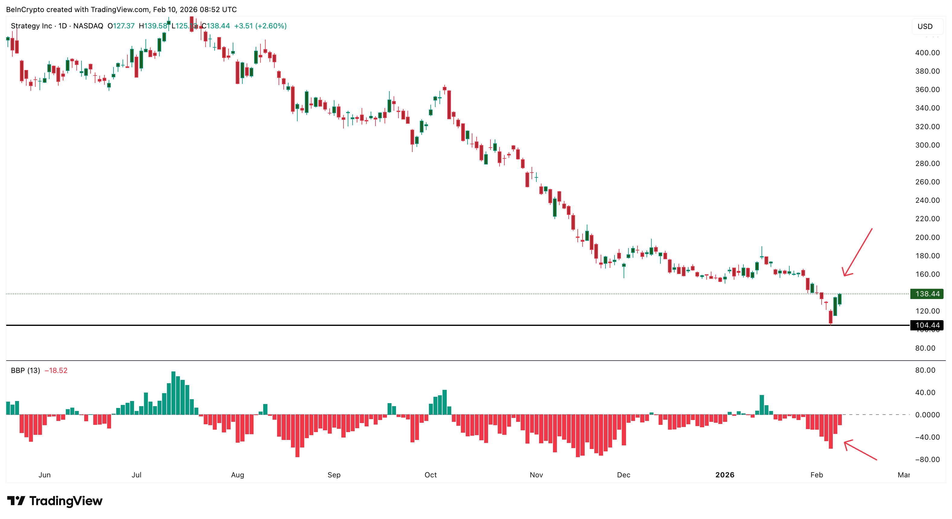 The Bull-Bear Power indicator measures whether buyers or sellers control short-term pressure. Despite the 33% rally in the MicroStrategy stock price, this indicator remains negative. Sellers still dominate. This means accumulation is happening, but control has not flipped.