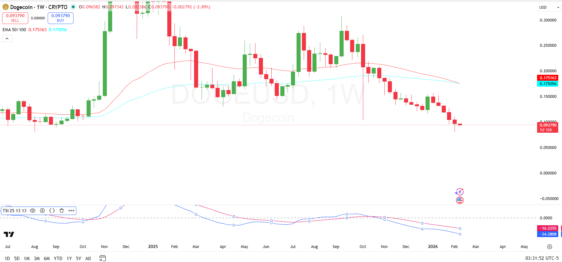 On the upside, Dogecoin faces layered resistance that reinforces the broader bearish structure. The first major ceiling sits near $0.175, aligning closely with the 50-week EMA, as well as the 100-week EMA. Beyond that, prior weekly highs around $0.20–$0.25 represent a heavier resistance band. Without a recovery of the EMA zone, upside moves will likely remain corrective.