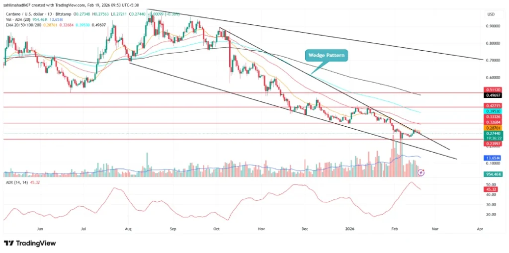 Since October 2025, the wedge pattern carried a steady downward trend in Cardano before the recent breakout signals a change in market dynamic. However, the buyers struggle to offer follow up amid current uncertainty in the broader crypto market.