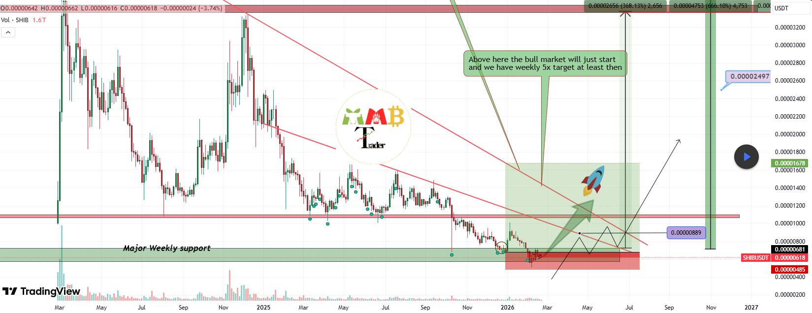 Based on the measured move highlighted on the chart, this move could initially target a threefold pump. This projection aligns with prior resistance zones and areas where supply previously overwhelmed buyers. Per the chart, the 3x rally would take $SHIB to $0.00001678.