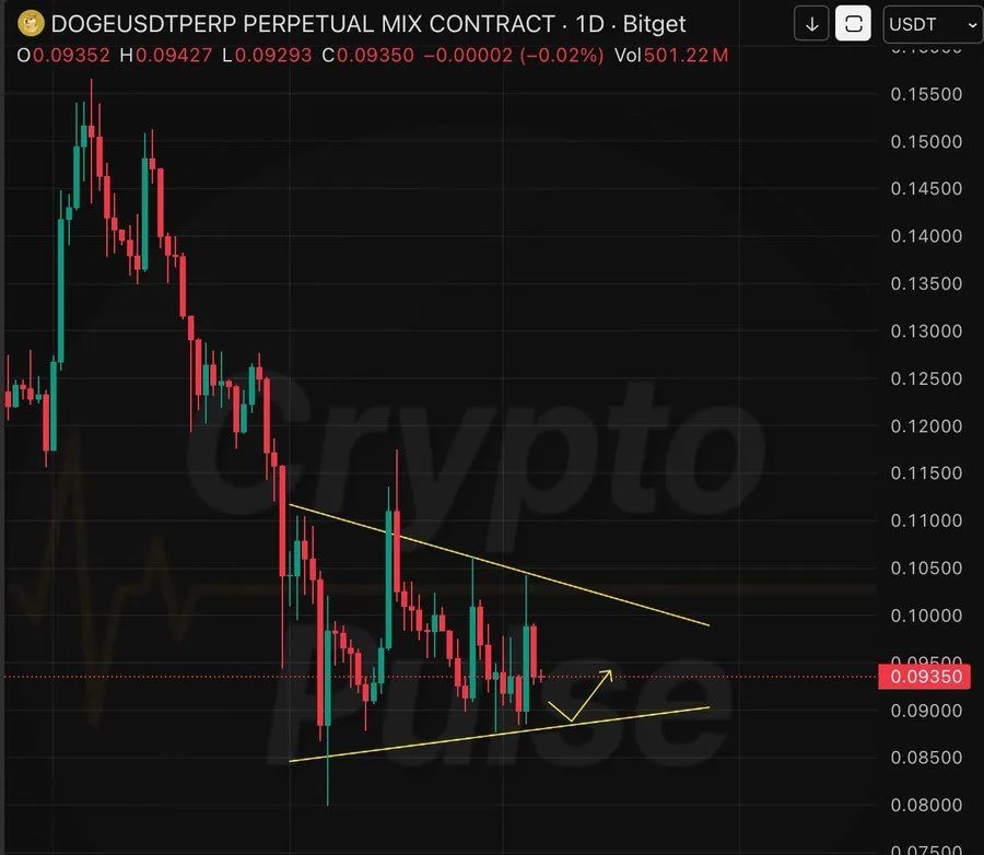 According to the analyst CryptoPulse, the chart indicates that Dogecoin ($DOGE) remains in a broader bearish trend on the daily timeframe. Price has been forming lower highs since the previous peak near the $0.15 region. Recently, the market stopped falling aggressively and moved into consolidation. The candles are compressing between two trendlines. This structure forms a symmetrical triangle or pennant pattern. Such patterns usually signal a pause before the next strong move.
