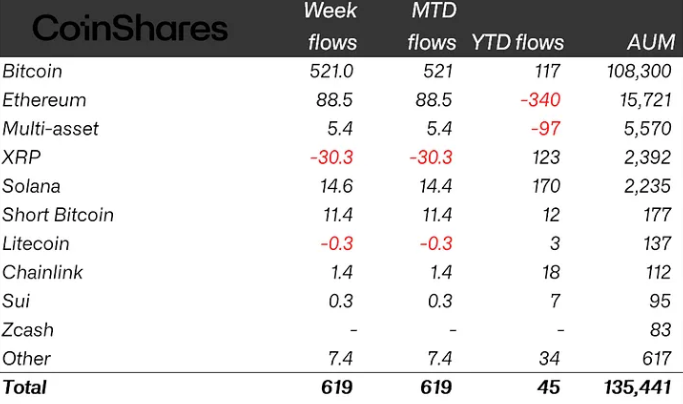 CoinShares records showed Bitcoin investment products absorbed $521 million in net inflows during the period. Ether products followed with roughly $86 million in new allocations. Solana funds added about $15 million as investors maintained interest in large altcoins.