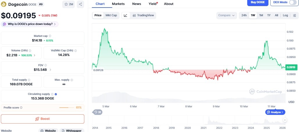 Dogecoin ($DOGE) price had spiked over 10% after Elon Musk announced early public access to X Money next, before retracing significantly to trade about $0.09195 on Wednesday, March 11, 2026.