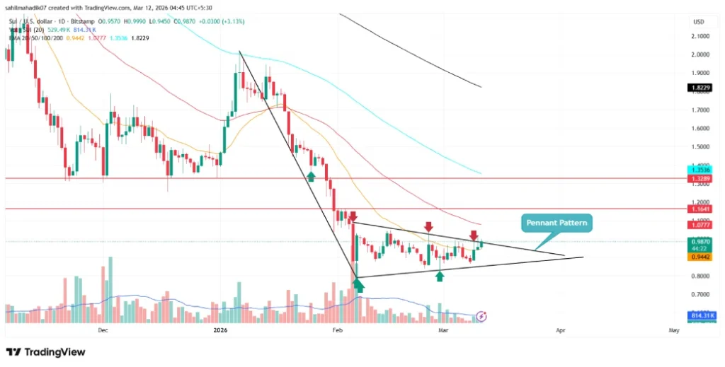 Since February 5th, 2026, the $SUI price has traded in a range-bound trend within two converging trendlines of an inverted pennant pattern. The chart setup is characterized by a downsloping pole indicating prevailing downtrend followed by such consolidation within the triangle to regain its bearish momentum.