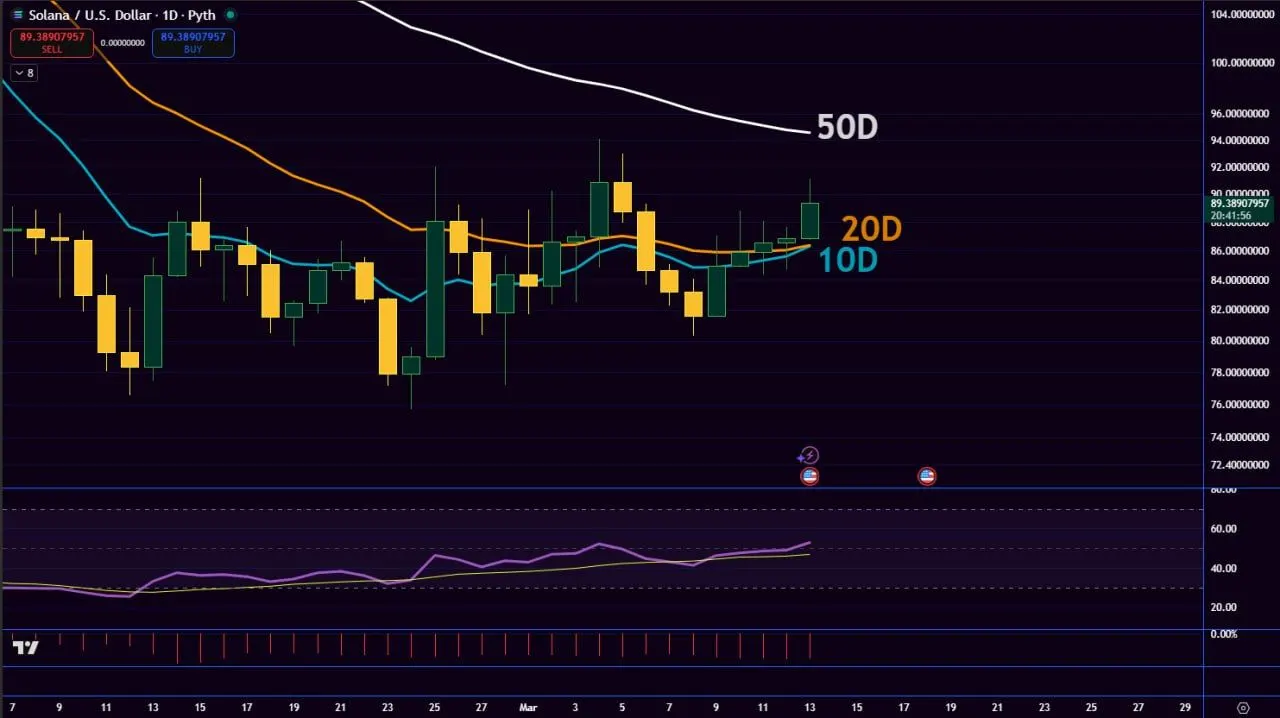 Solana is showing early signs of strength on the daily chart as price holds near $89 and continues to print higher lows from the $78 level. This structure suggests the market is stabilizing after the previous decline. Each pullback since late February has stopped at a higher point, which indicates buyers are gradually stepping in.