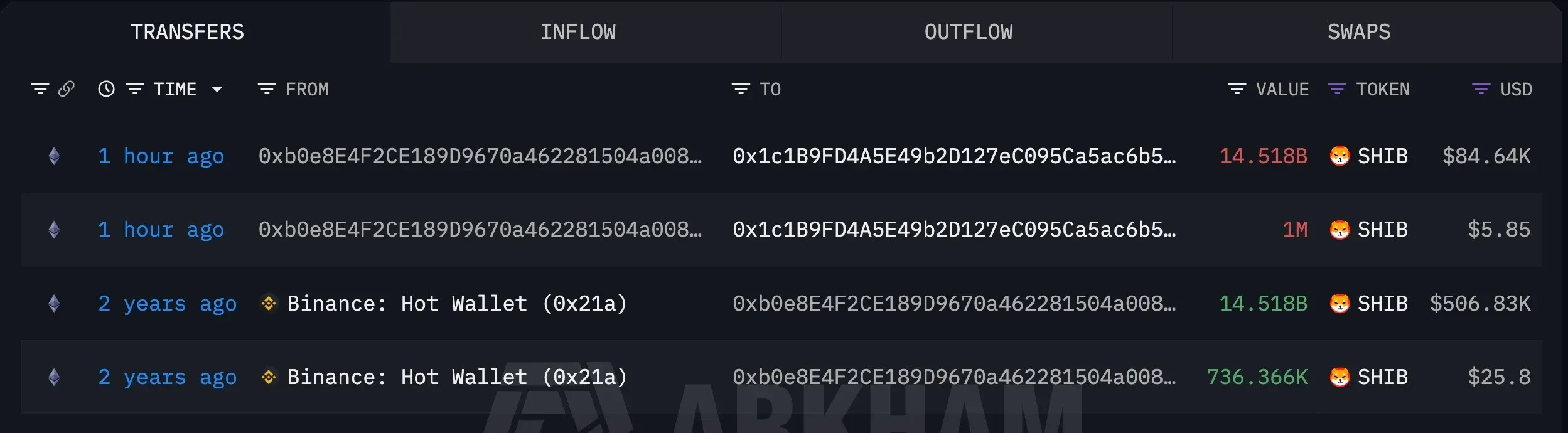 A mid-tier crypto investor, commonly known in market circles as a "shark," has closed out a Shiba Inu ($SHIB) position after 2 years, walking away with an 83.2% loss. Blockchain data from the Arkham intelligence platform confirmed the move. The wallet address "0xb0e8" ended a two-year period of dormancy with a series of transfers to Binance, the world's largest cryptocurrency exchange by trading volume.