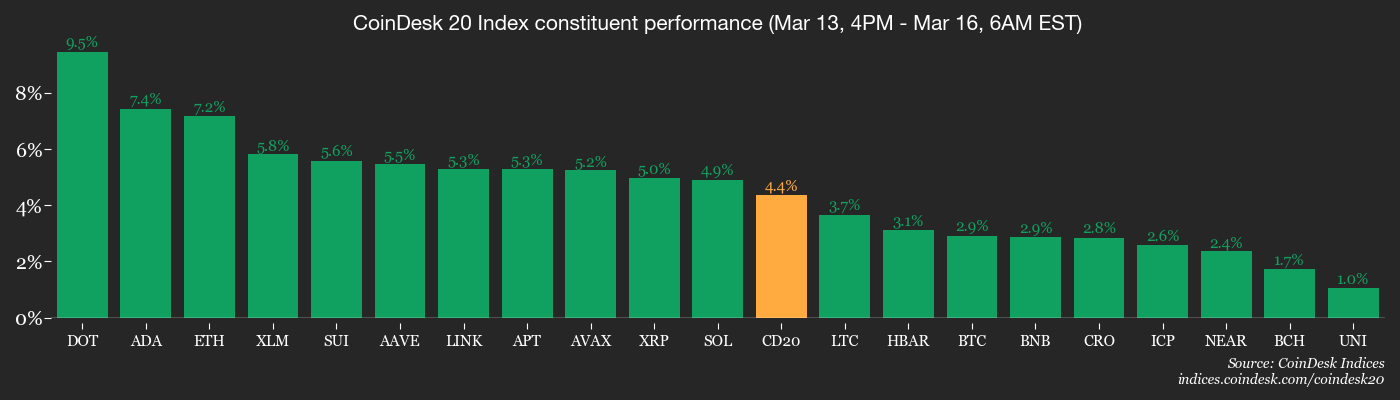 Among the majors, bitcoin jumped more than 2% in 24 hours, and at one point early Monday briefly topped $74,300 for the first time since early February. Other tokens including $XRP ($XRP) and solana (SOL) gained over 4%, and ether ($ETH) rose 7%. The CoinDesk 20 Index added nearly 4%.