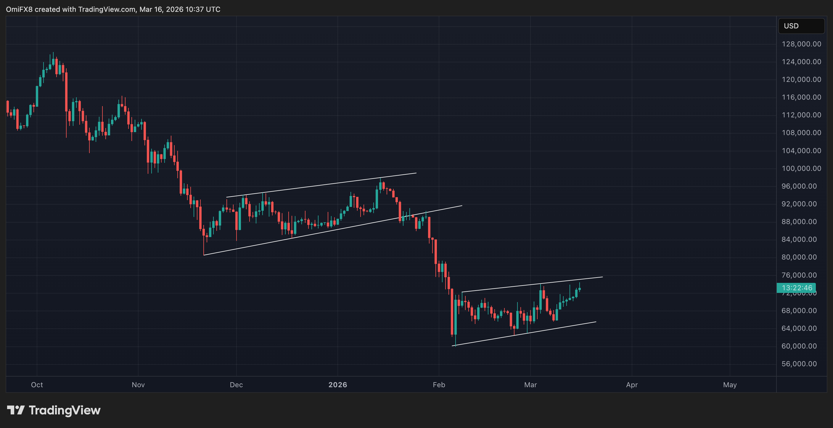 - Despite the recent bounce, $BTC remains trapped in a sideways grind marked by trendlines connecting highs hit on Feb. 8 and March 4 and lows from Feb. 6 and Feb. 24.