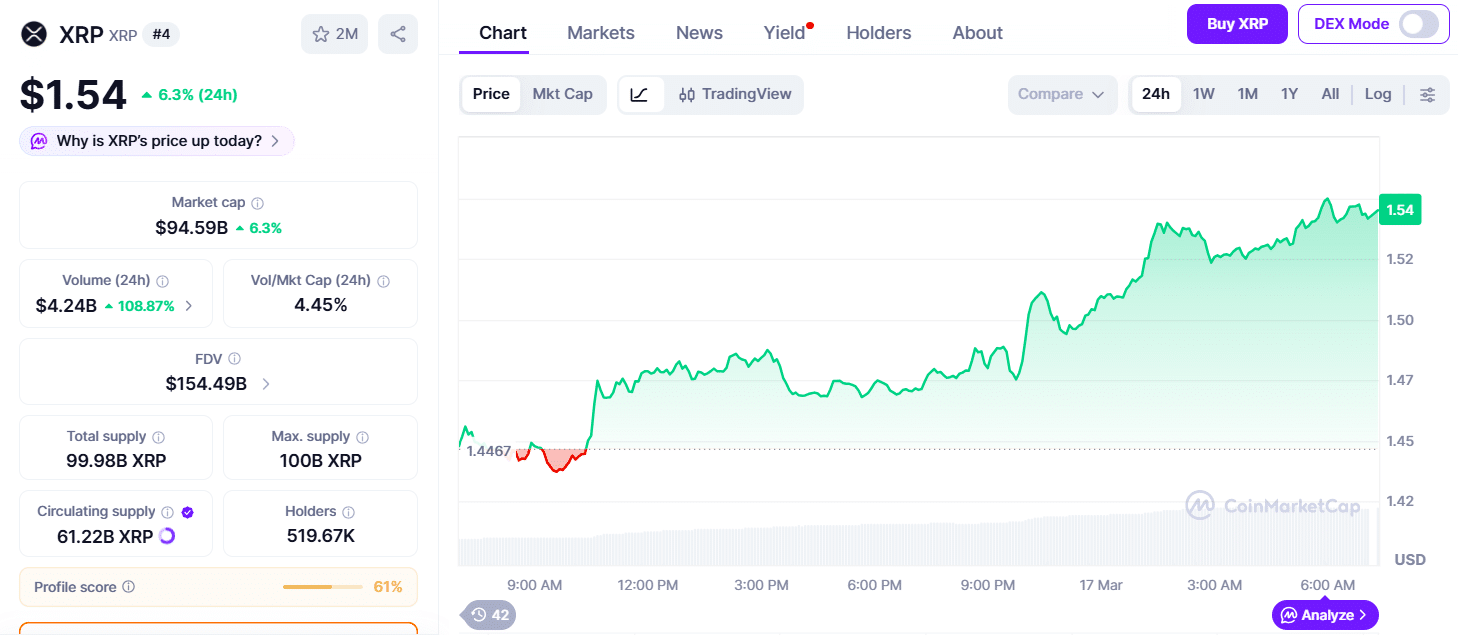 $XRP surged past $1.5 on Monday, extending its gains as the crypto market rallied under Bitcoin’s lead. The token has climbed roughly 13% over the past week, driven by renewed investor interest and improving market sentiment, CoinMarketCap data shows.