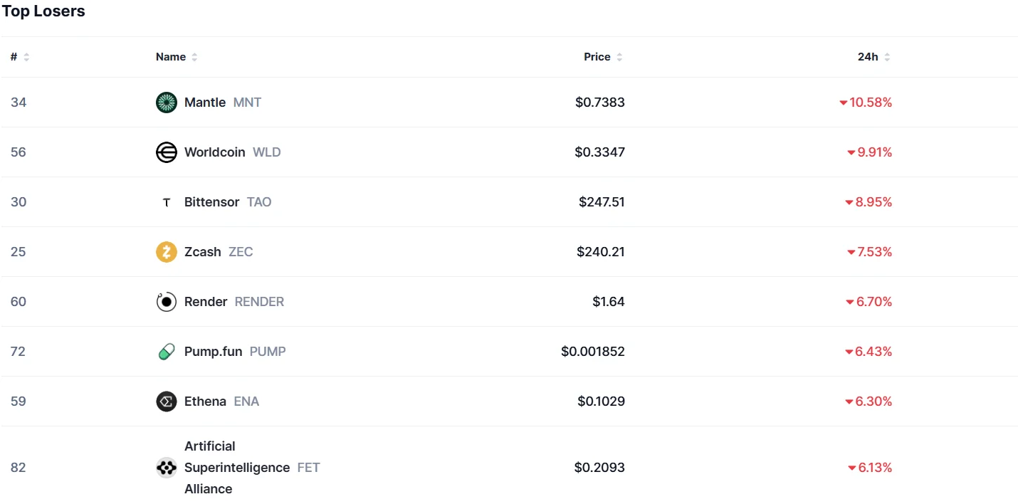 According to Coinmarketcap data, the biggest losers in the last 24 hours are as follows: 1st place Mantle (MNT) with a 10.5% loss, 2nd place Worldcoin (WLD) with a 9.9% loss, 3rd place Bittensor (TAO) with an 8.9% loss, 4th place Zcash (ZEC) with a 7.5% loss, and 5th place RENDER with a 6.7% loss.