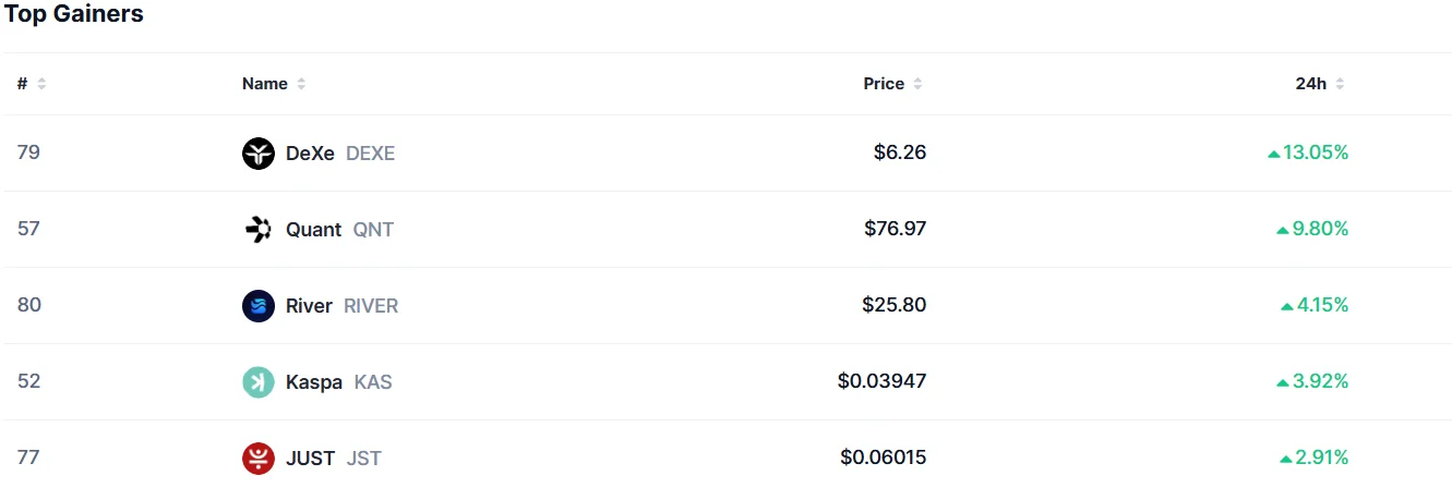 According to CoinMarketCap data, $DEXE (13.05%), $QNT (9.8%), $RIVER (4.1%), $KAS (3.9%), and $JST (2.9%) were among the top-performing altcoins, outperforming the market.