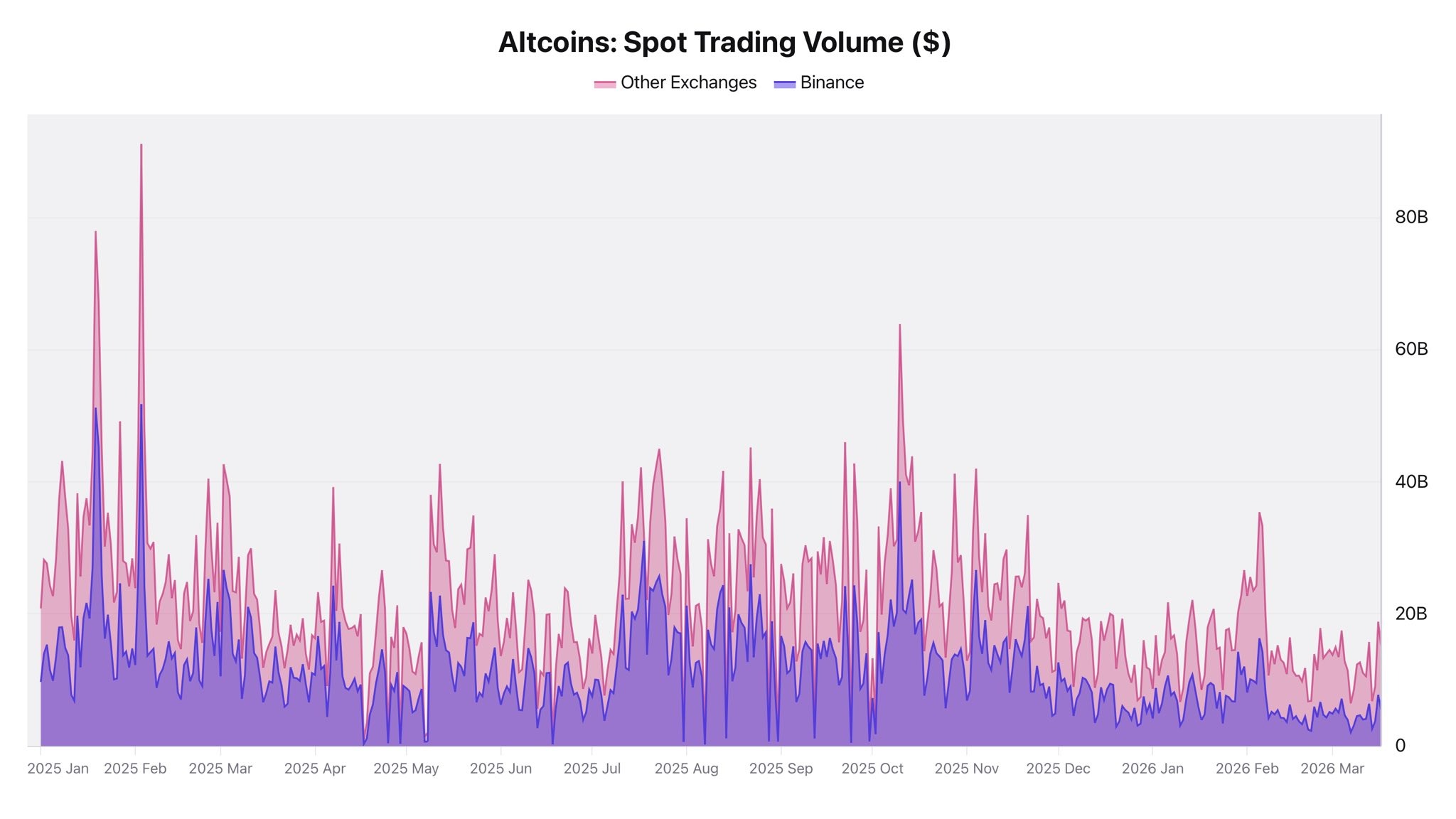 Looking back, major spikes in altcoin trading volume were seen during February and October 2025. During these periods, Binance recorded between $40 billion and $50 billion in volume, while other exchanges reached as high as $91 billion.