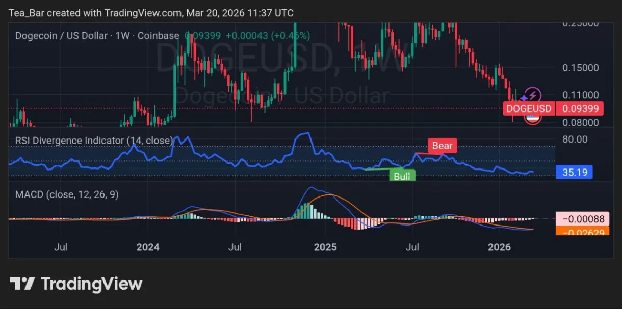 The weekly $DOGE/USD chart reflects clear signs of exhaustion after an extended downtrend. Price has stabilized around $0.094, posting a modest +0.45% weekly gain.