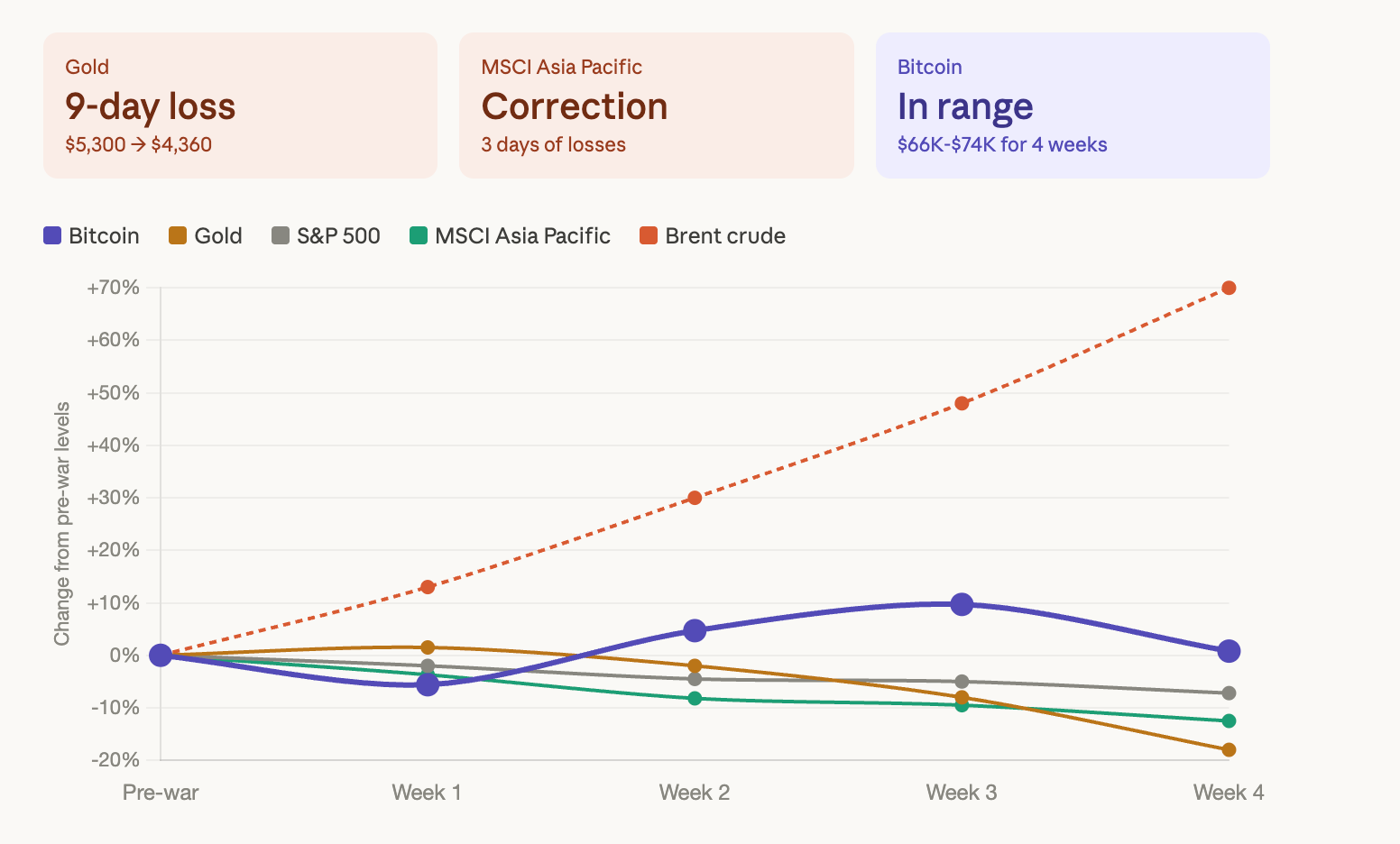The weekly numbers are ugly across the board. Gold, the asset that's supposed to outperform in geopolitical chaos, has lost roughly 18% from its recent highs. Asian equities are entering a correction. Bitcoin is down 6% on the week but still trading above the $66,000 floor that held through every war-driven sell-off since Feb. 28.