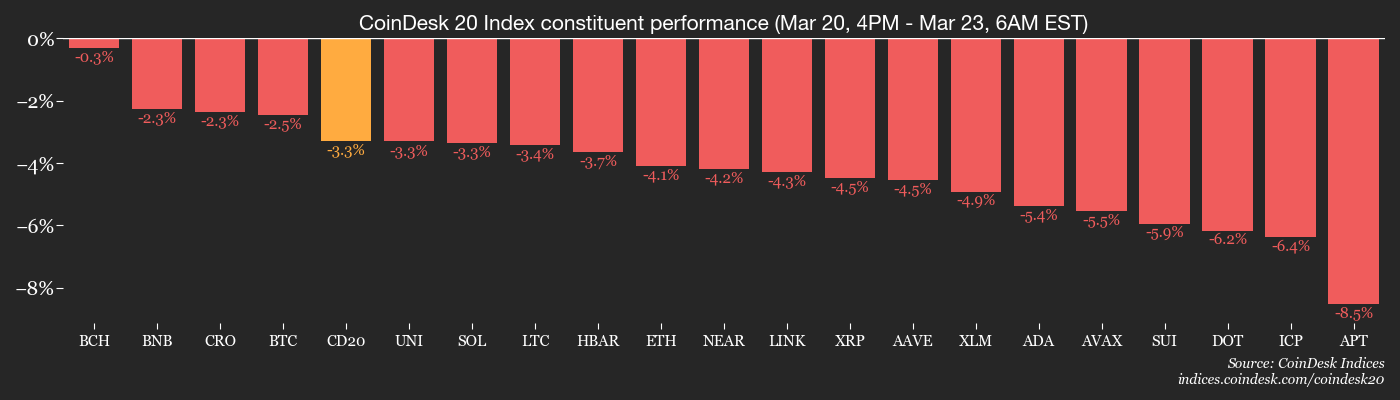 For now, however, the conflict is in its fourth week and keeping valuations under pressure. Bitcoin $BTC$68,358.29 held below $69,000 at the time of writing, maintaining losses from the weekend. Ether fell to $2,030, its sixth decline in seven days. $XRP ($XRP), solana (SOL), DOGE$0.09045 and others were also under pressure, while a few privacy tokens such as NIGHT and XMR stood out with gains of over 3% in the past 24 hours.