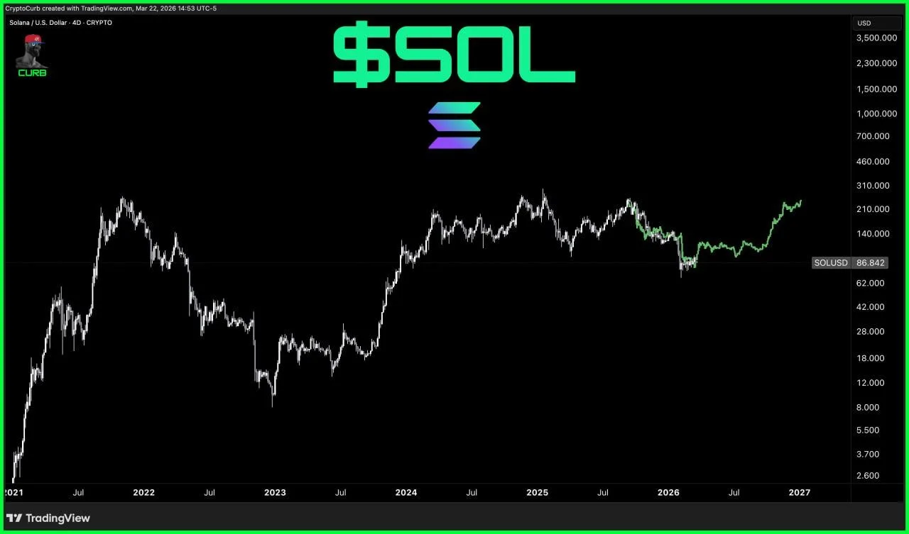 The chart also places this potential move in a broader multi year context. Solana previously saw large swings between 2021 and 2025, including sharp rallies, deep corrections, and repeated recovery attempts. Against that backdrop, the projected path implies the market may be trying to rebuild structure rather than stay locked in a prolonged downtrend.