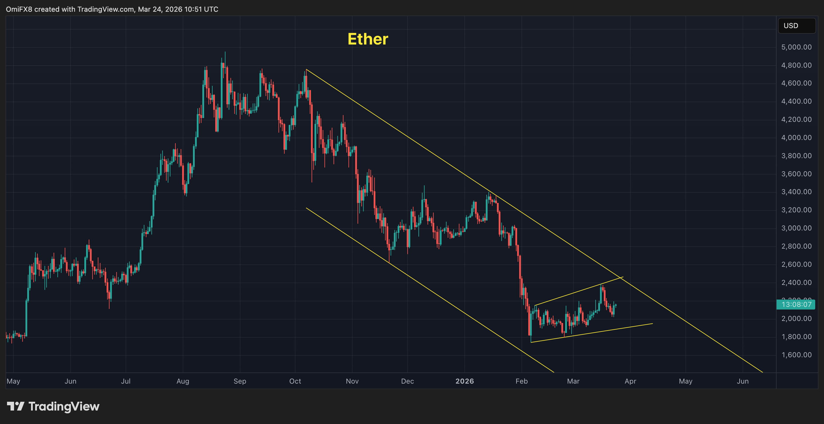 - The $ETH price appears stuck in a choppy back-and-forth trading range, within a broader bearish trend.