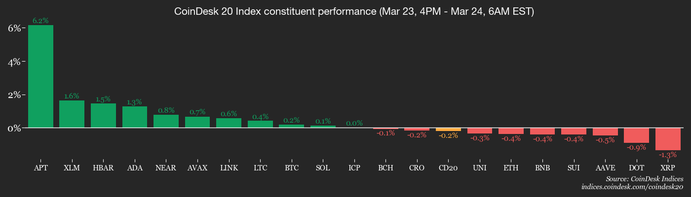 Still, bitcoin held steady and is looking to extend yesterday's 4.47% surge, the biggest since March 4. Ether ($ETH), $XRP ($XRP) and solana ($SOL) are following $BTC's lead, as usual, alongside a 24-hour jump of 4% in the CoinDesk 20 Index.