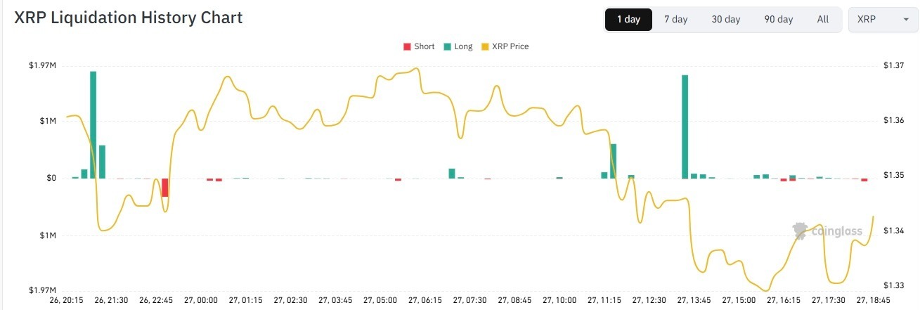 Despite derivatives traders pricing in a bullish tilt, $XRP’s spot price fell 1.27% over the past 24 hours to approximately $1.34 at the time of reporting. This has pushed the asset’s weekly decline to over 7%, hence compressing its market capitalisation to approximately $82 billion.