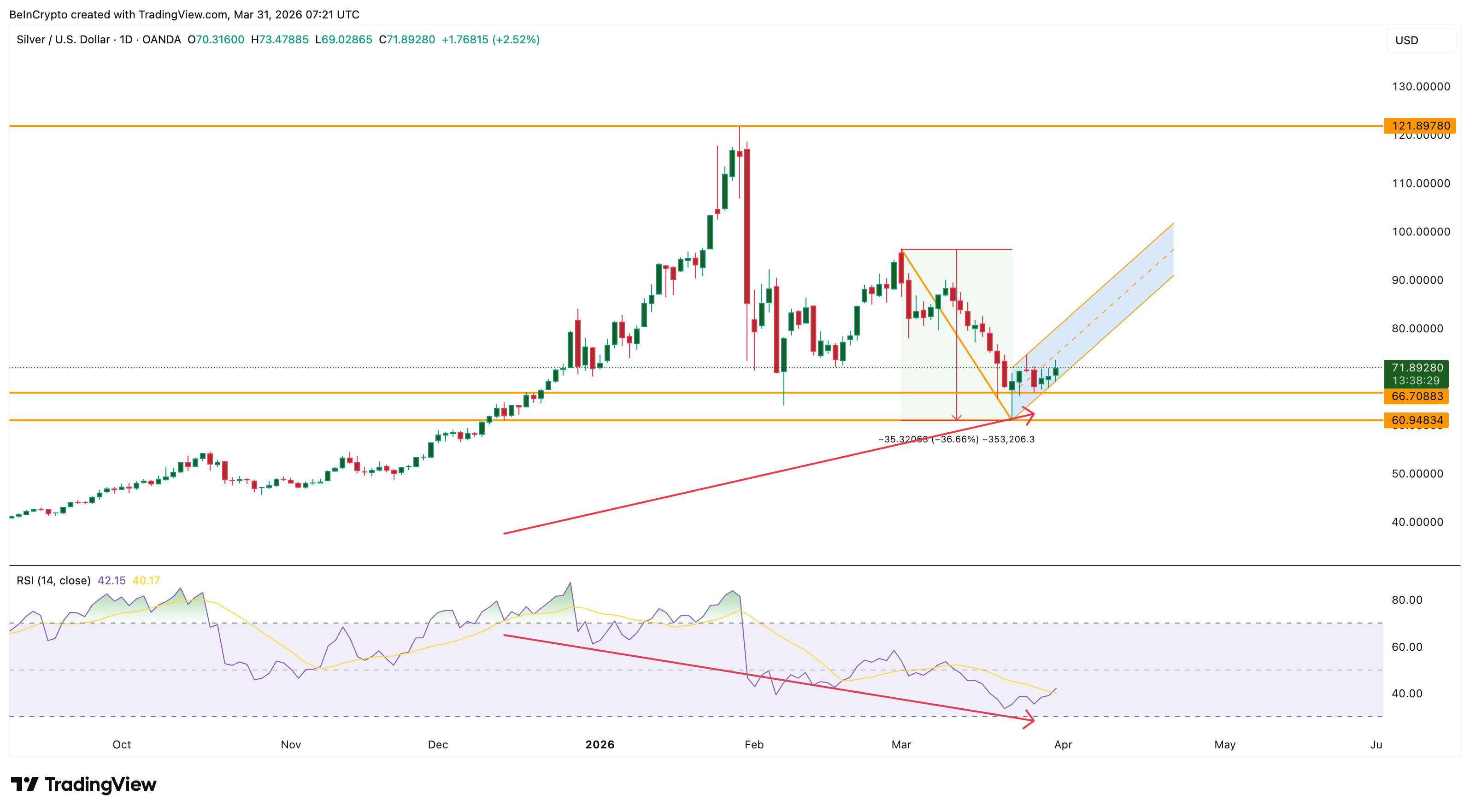 The daily chart shows that between December 12 and March 26, silver price printed a higher low while the Relative Strength Index (RSI), a momentum indicator, made a lower low. The RSI’s previous low came from a deeply overbought region, which means the momentum reset was more structural than panic-driven. This hidden bullish divergence suggests that selling pressure behind the correction from $121 has been gradually exhausting itself.