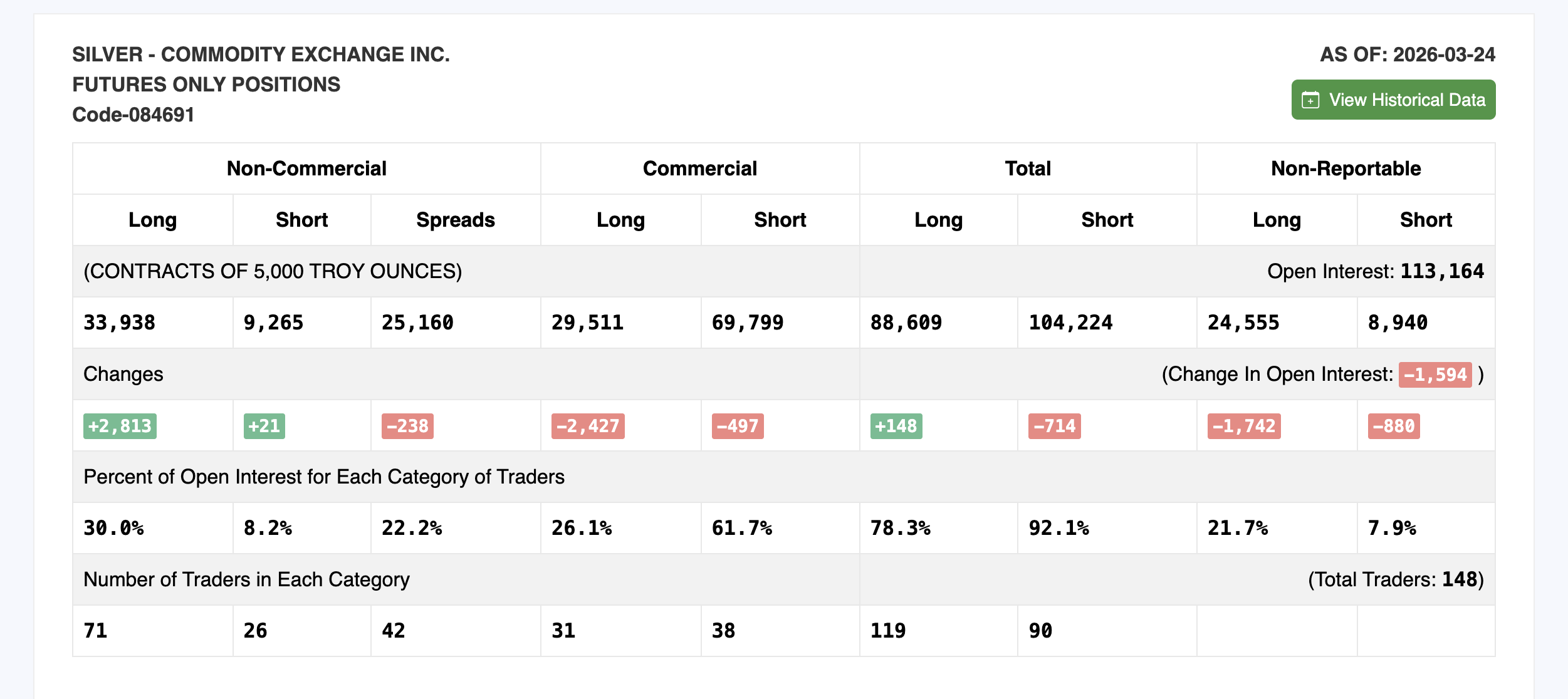 The Commitments of Traders (COT) report, published weekly by the Commodity Futures Trading Commission (CFTC), now confirms that positioning is shifting. The March 24 snapshot shows non-commercial longs rose by 2,813 contracts to 33,938, the first meaningful increase after weeks of consecutive declines. Shorts barely moved, adding just 21 contracts to 9,265.