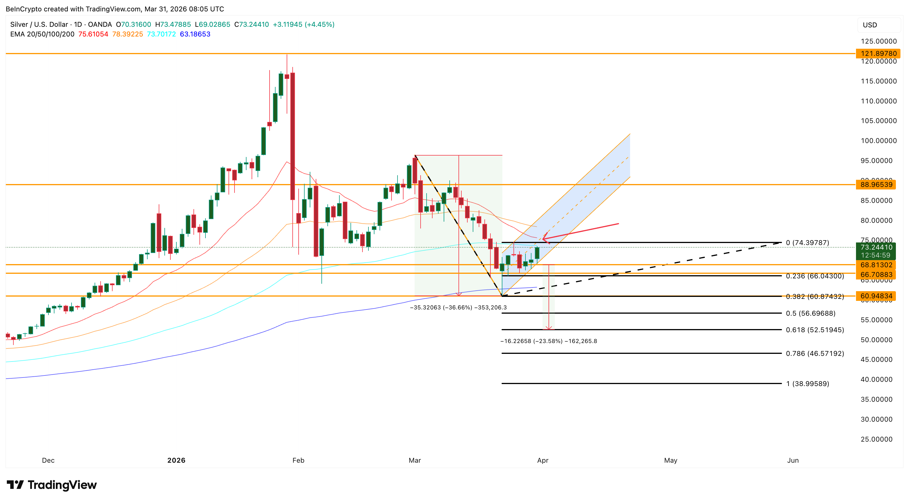 The COT data and the hidden divergence suggest the bottom may be forming. The price structure says it is not yet confirmed. A sustained daily close above $74 separates a genuine recovery toward $88 from a bear flag breakdown toward $52.