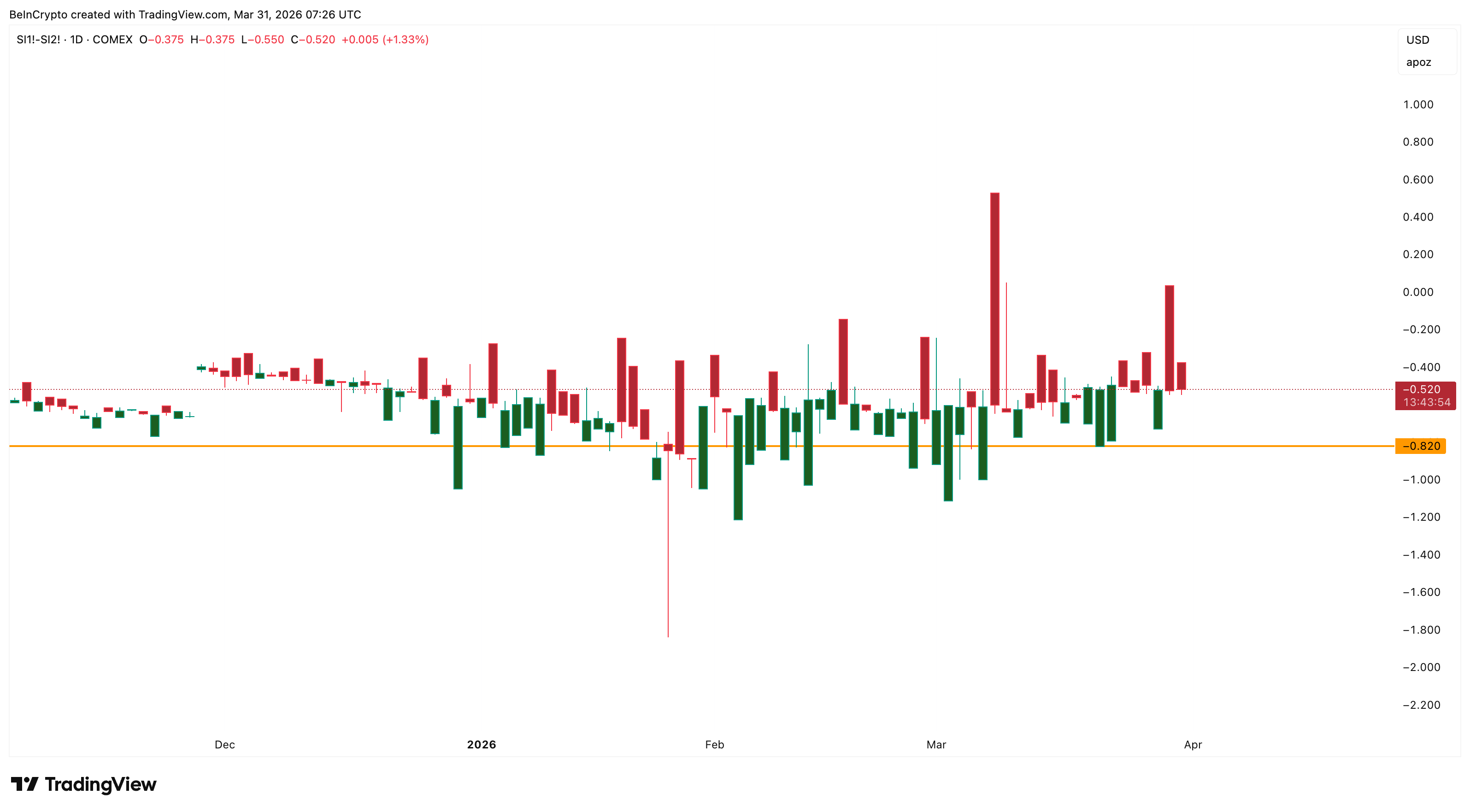 The COMEX silver futures spread (SI1 minus SI2) adds a supporting layer. Silver remains in contango, where future prices trade above near-term prices, signaling no urgency to buy immediately.