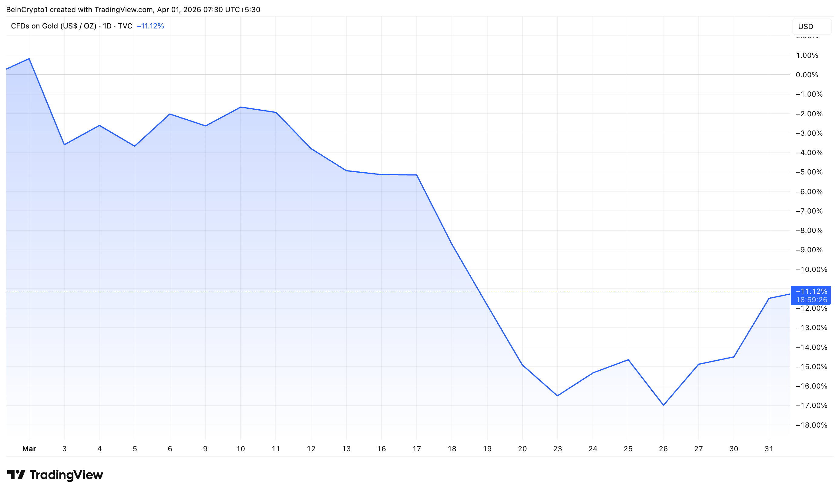 US-Israeli strikes launched against Iran in late February closed the Strait of Hormuz, sending crude prices sharply higher. Instead of drawing safe-haven flows, bullion trended downwards. BeInCrypto reported that gold recorded its steepest weekly loss since 1983 this month.