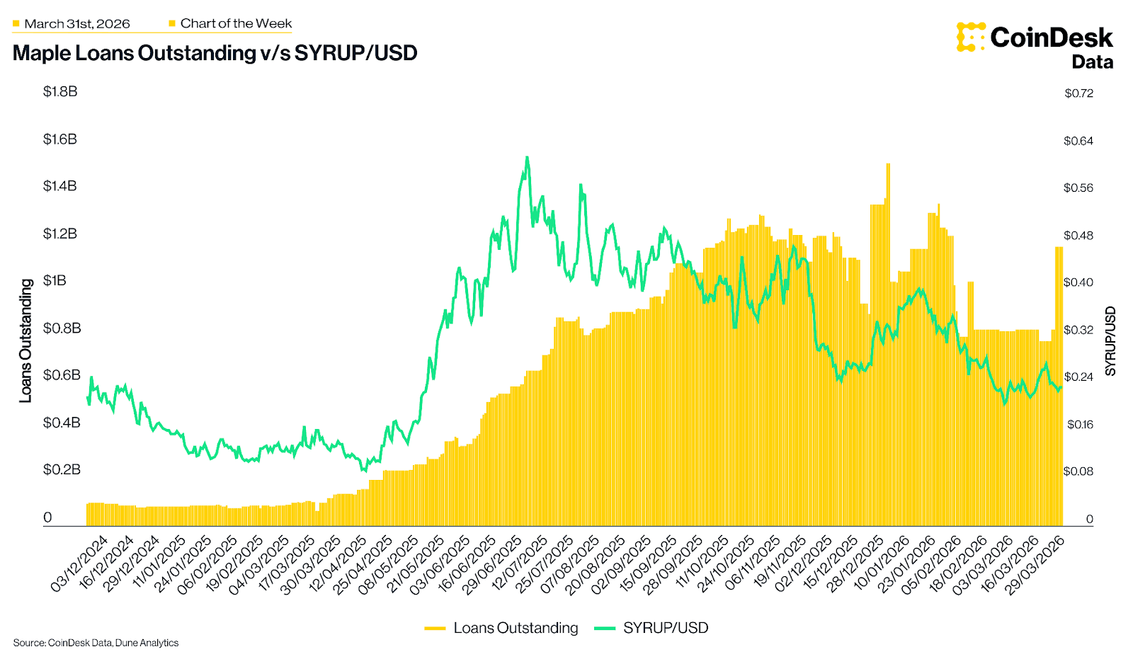 Maple's loans outstanding jumped back above $1 billion last week as the protocol issued $350 million in loans on a single day. With total AuM now exceeding $4.6 billion, there is a divergence between the protocol's strong fundamentals and the associated SYRUP token price action. This growth, in spite of broader market conditions, continues to highlight the resilient demand for institutional-grade lending among crypto-native firms.