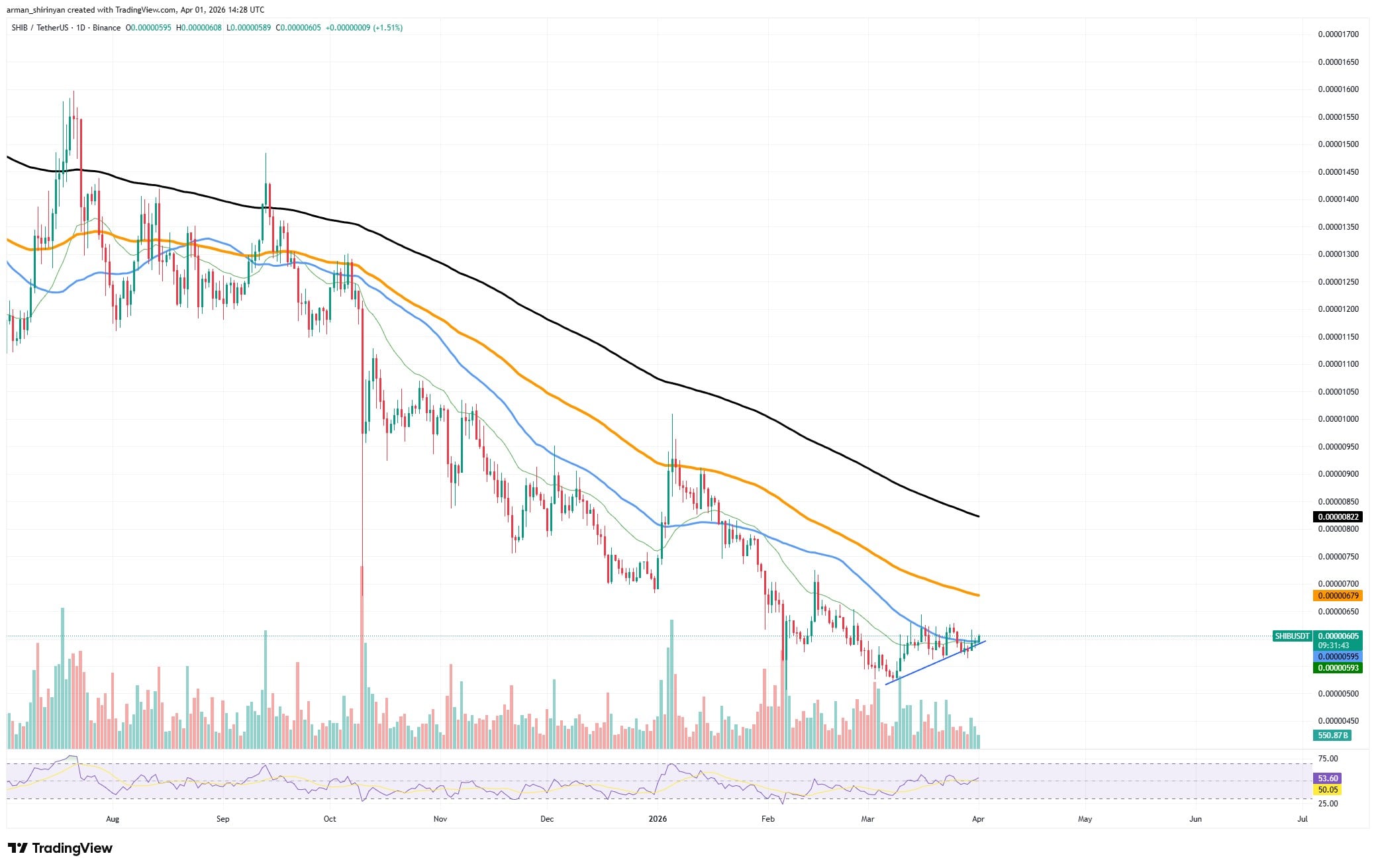 In order for $SHIB to truly come back to life, there must be a clear break above the existing wedge resistance and a discernible volume increase. Without it, the current configuration runs the risk of becoming a continuation pattern instead of a reversal, which means a breakdown is still equally likely.
